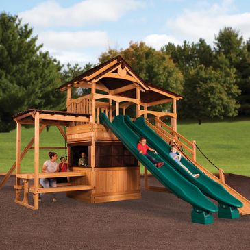 The all new, completely re-designed Treehouse style swing sets include an improved structural design with bi-directional bolt through construction, increased modularity, and many new play features. You can attach the new pergola to any Treehouse fort to create the perfect backyard play and relaxing space. The pergola is designed to stand alone or include a built-in picnic table… your choice! Playhouse and cabin enclosure doors are much taller for older children, and the new hybrid playset design combines the best of all playsets into a single play system.